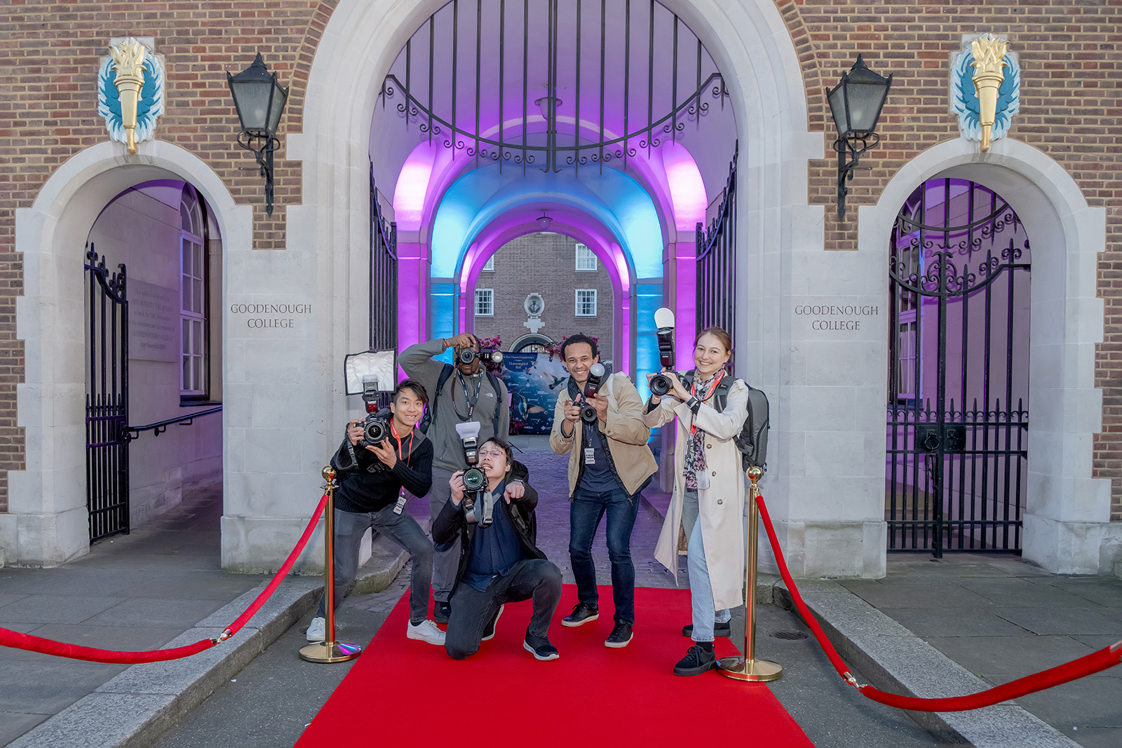 Faux paparazzi photographers, lined up to capture guest arrivals at The Kay Mason Foundation's charity fundrasing Hummingbird Ball at Goodenough College, London.